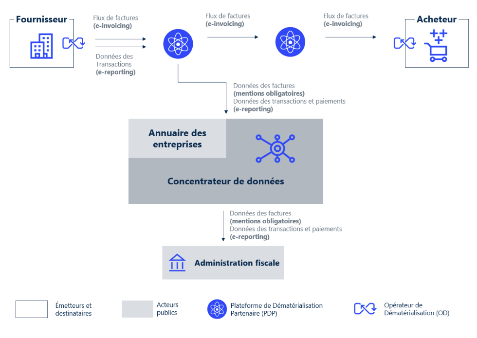 Ce schéma simplifié illustre le processus de passage à la facturation électronique, qui remplace les factures papier par des documents numériques. Il se compose de plusieurs étapes clés :